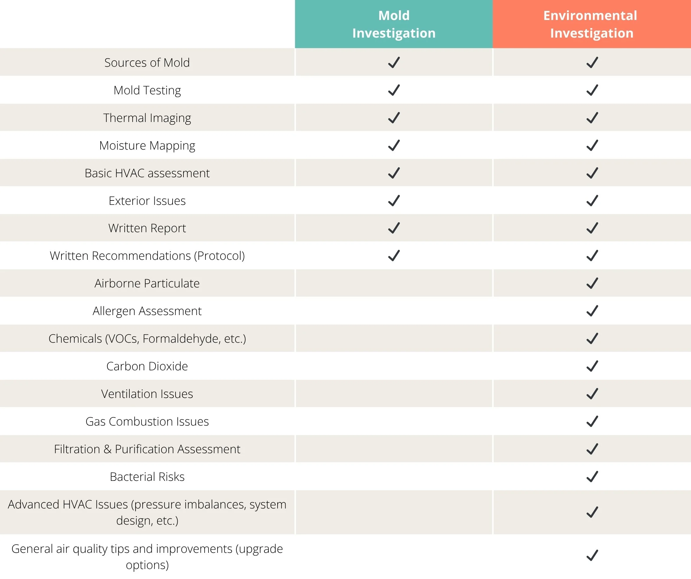 Mold is not the only air quality issue in a home. Anytime we hear “we are sick in our home and don’t know why”, that is cause to perform a more holistic investigation. If we just focus on mold (which is of course on the forefront of homeowner’s minds), we can miss so many other issues that could impact the air quality; especially for occupants that are already facing health issues related to mold and need a place to heal. So what’s the difference between the Mold investigation and Indoor Environmental Investigation?